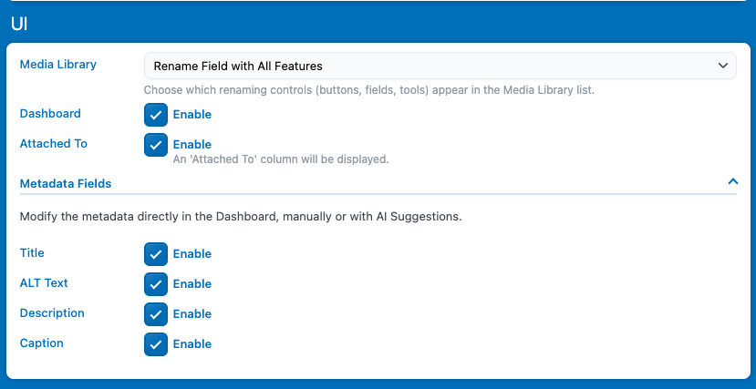First, go to Settings → Basics → UI, then select which metadata fields you want to view and edit. In this example, we’ll enable all of them: Title, ALT, Description, and Caption.