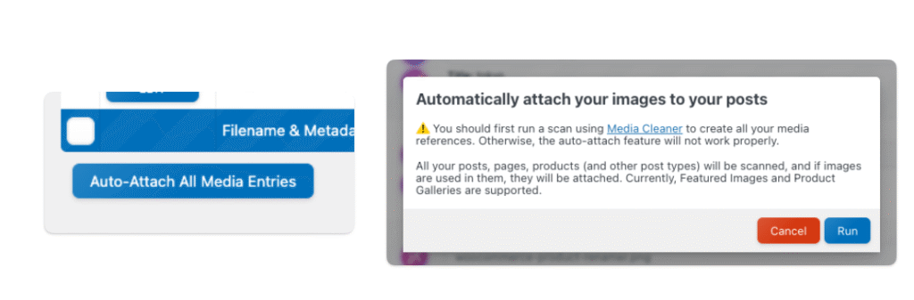 Before running this, you’ll see a warning suggesting that you run a Media Cleaner scan first, and that’s strongly recommended. Media Cleaner will analyze all your media and detect where each file is used, providing more accurate and reliable attachment data for the auto-attach process.