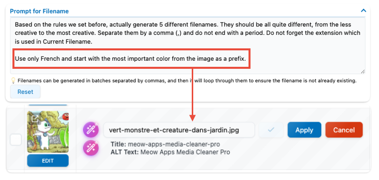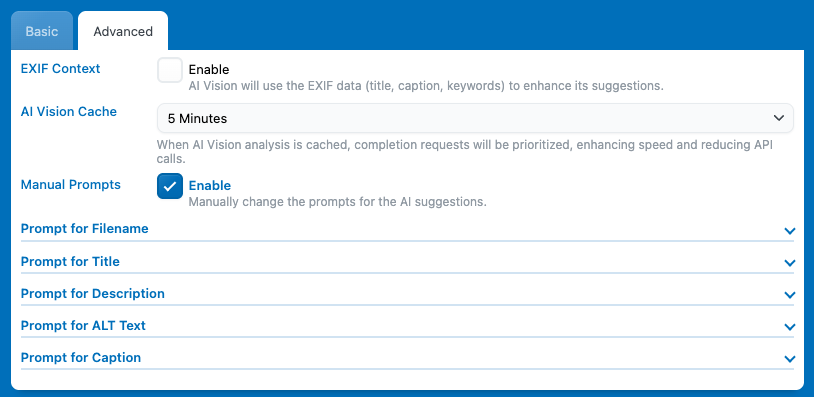 Here, you can change the prompts used by the AI models for each field of your files. This is useful if you want to adjust how the data is interpreted, the language used, or the style of the filenames.