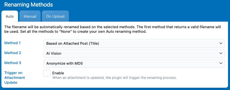 If none of the built-in methods fit your specific needs, you can explore the Advanced Renaming documentation to learn how to create your own custom renaming method, giving you full flexibility over how filenames are generated and managed.