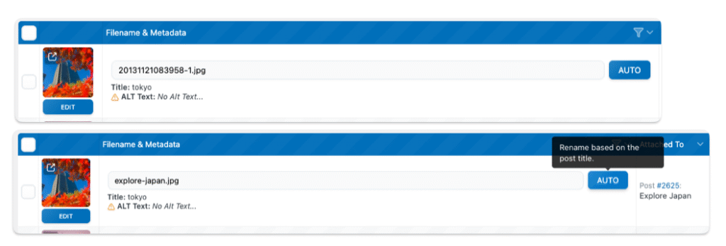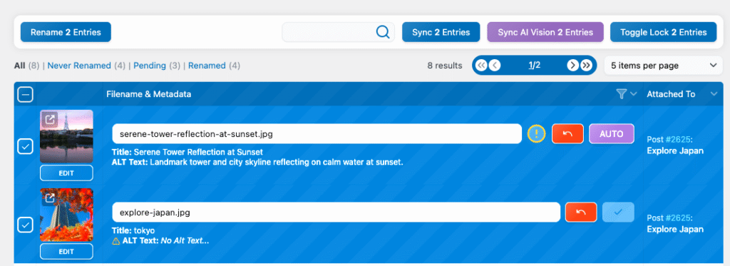 Now that your AUTO button is ready, go to the dashboard. You can either manually click the AUTO button for each media file, or select multiple items and use the “Rename X Entries” button to rename them all at once.