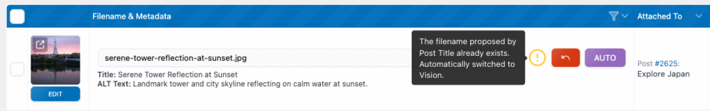 Since Method 1 is based on the related post title, it can produce duplicate filenames when multiple media items share the same post title. Because filenames must be unique, this triggers an error, and Media File Renamer automatically switches to Method 2 (in this example, AI Vision) to generate a valid, unique filename instead.