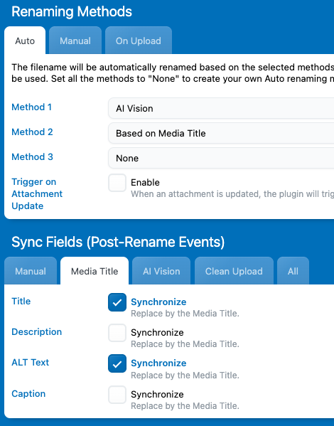 The exception is AI Vision, which doesn’t simply sync the filename, instead, it analyzes the image content and generates unique, optimized metadata for each field, making your media library more descriptive and SEO-friendly.