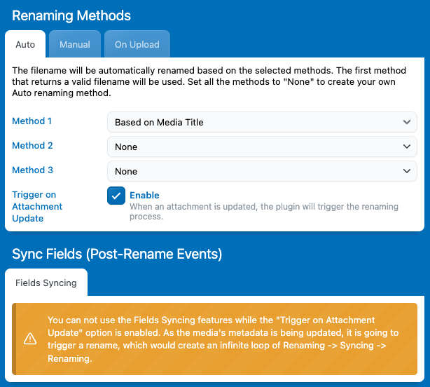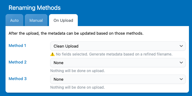In Settings → Renaming Methods → On Upload, you can configure up to # methods for automatic renaming when files are uploaded. If one method fails, Media File Renamer will automatically try the next one in order.