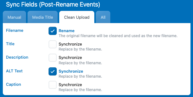 - Clean Upload: Breaks the filename into readable parts to generate metadata — for example, this-is-my-file.jpg becomes This Is My File.