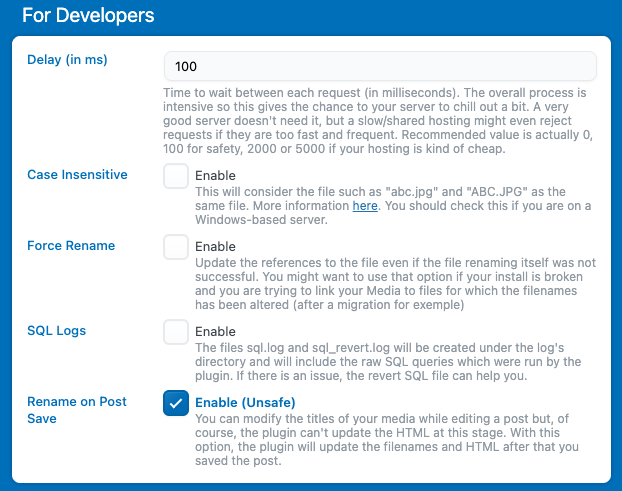 However, keep in mind that this feature is considered unsafe. It attempts to modify filenames and update references while a post is being saved, which can sometimes lead to unexpected results or broken links. For this reason, it’s generally recommended to rename your files afterward using the dashboard instead, where the process is more controlled and reliable.