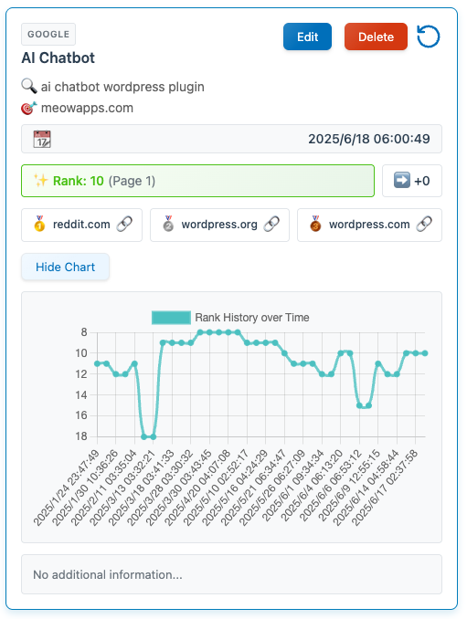 This card will show your current rank, the latest changes, and the top three sites that appear for this specific search.