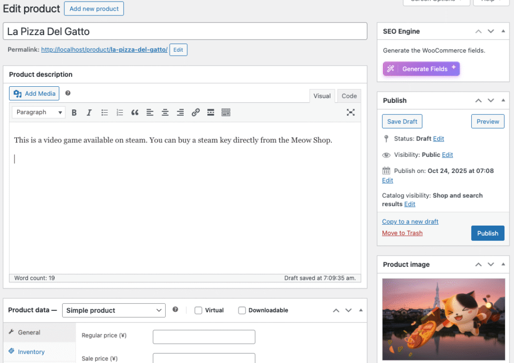 Once this module is enabled, you can go to any of your WooCommerce products, and you will see a new button available in the WooCommerce menu window: SEO Engine – Generate Fields.