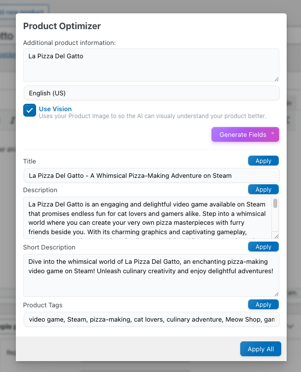 You can simply click it to open a modal that allows you to select the language in which you want to generate your product information, generate the new data, and then click “Apply All” to fill in all of your data.