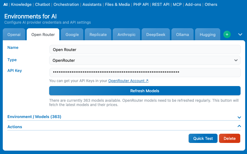 First, go to AI Engine → Settings → AI → Environments for AI. Make sure you’ve created and configured the environment that has access to the model you want to use. In this example, we’ll use an OpenRouter environment.