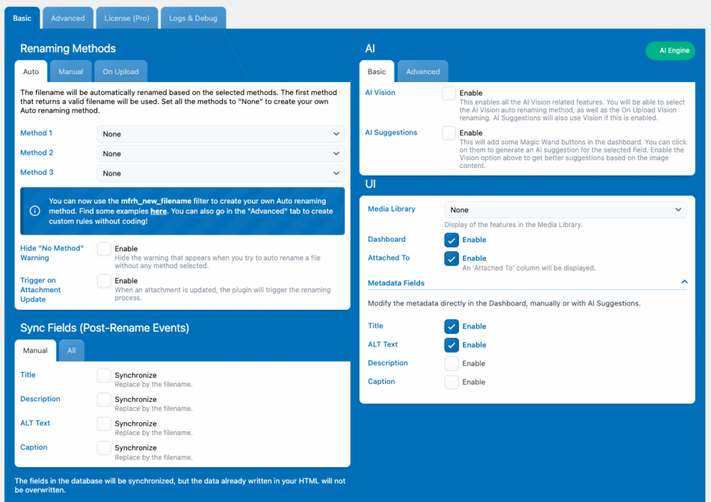 Next, simply enable the “AI Vision” option, this allows the plugin to analyze your images visually and generate more accurate, context-aware filenames.