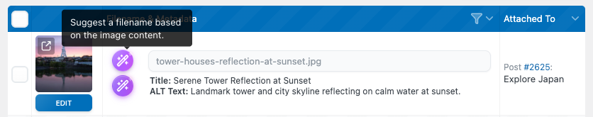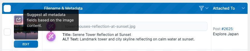 Once enabled, you’ll see wand icons appear in your dashboard. These let you generate metadata with a single click:
