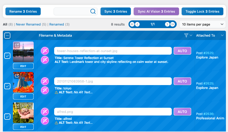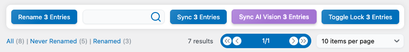 In that case, go to the dashboard, select the media files you want to process, and click the “Sync with AI Vision” button in the toolbar. This will trigger the Sync event using AI Vision, generating titles, alt texts, and descriptions without changing the filenames.