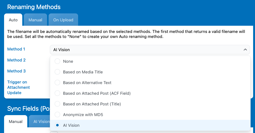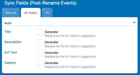 In the Settings, navigate to the Sync Fields section. Under the AI Vision tab, open the “AUTO” section, this is where you can configure which fields should be automatically updated or generated.