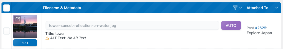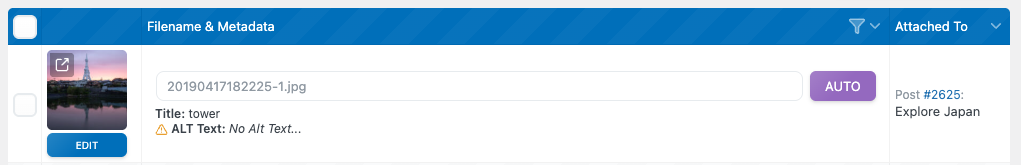 Now, go to the dashboard, where you’ll see your list of media files. Each file should have a purple “AUTO” button next to it — and in Meow Apps plugins, purple means AI is at work.